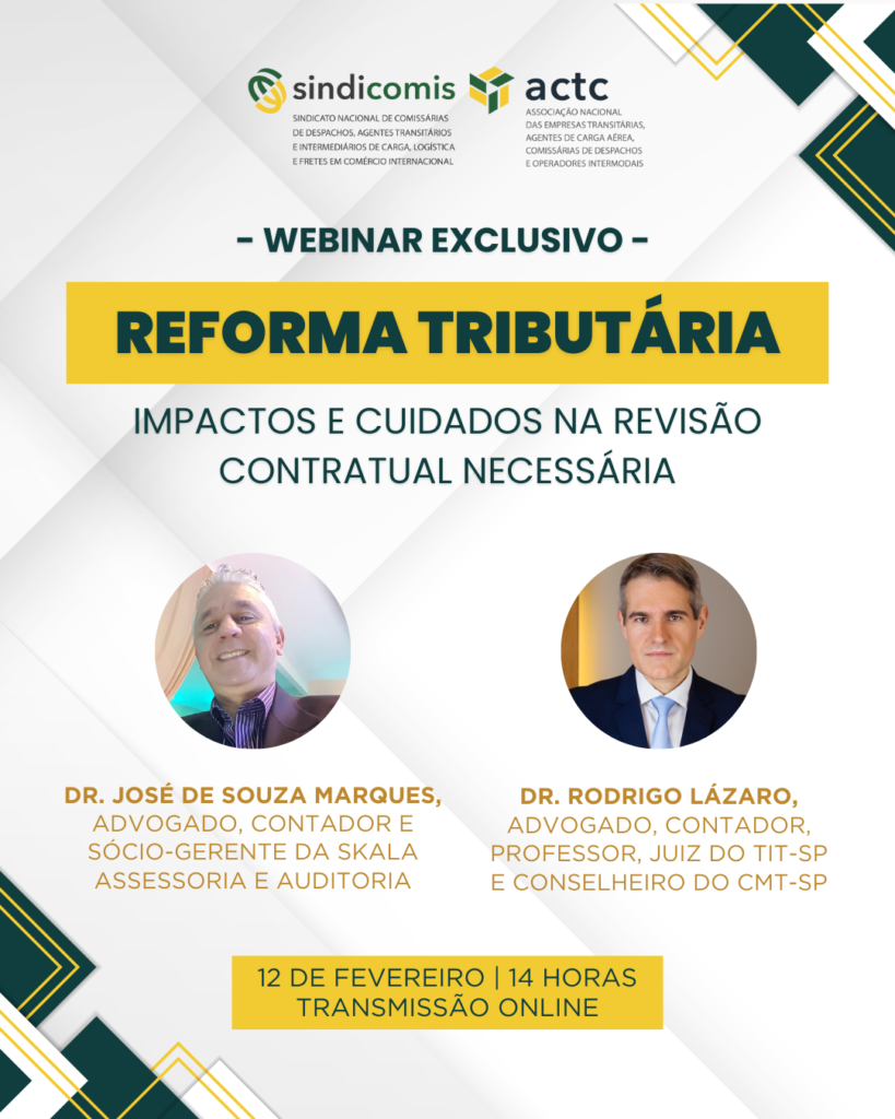 O SINDICOMIS NACIONAL e a ACTC realizarão, em 12 de fevereiro, às 14 horas, a palestra “Reforma tributária e contratos: impactos e cuidados na revisão contratual necessária”. O evento, com duração estimada de uma hora, será realizado exclusivamente no formato online e é direcionado aos associados e filiados. “As empresas que atuam no comércio exterior […]