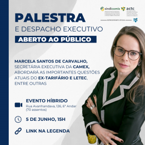 Marcela Santos de Carvalho, secretária executiva da Câmara de Comércio Exterior (Camex) do Ministério do Desenvolvimento, Indústria, Comércio e Serviços (MDIC), é a convidada especial da próxima edição do COMITEC. O evento está marcado para 5 de junho, às 15 horas, no auditório do SINDICOMIS/ACTC. Haverá opção de transmissão online para quem não puder comparecer presencialmente.